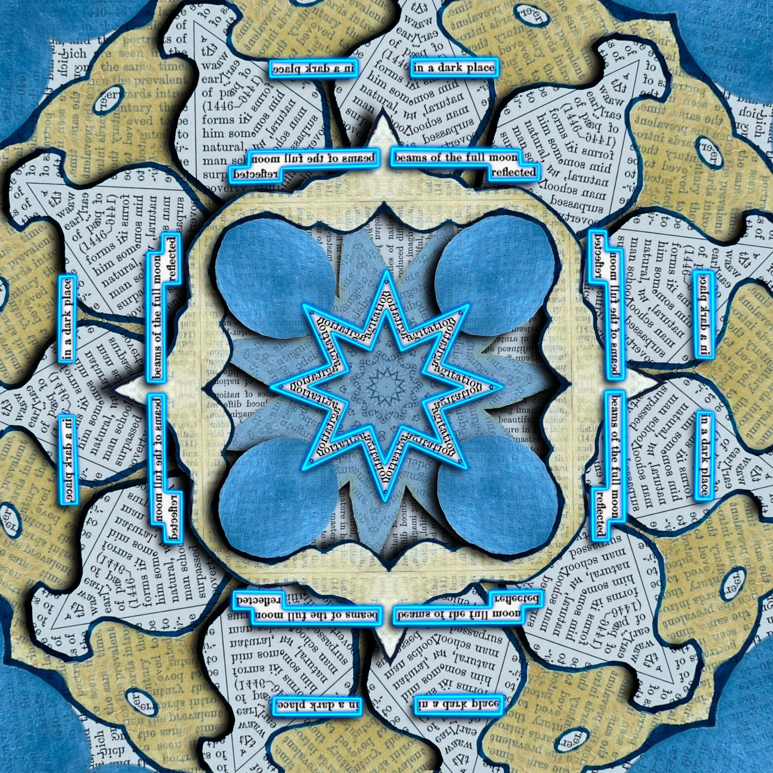 The exhibition explores the fluid border between text, image, and space—extending visual poetry into sculptural and virtual realms using a hybrid methodology grounded in collage, altered texts, hand-painted materials, VR-based 3D construction, & videopoetic works. No generative AI was used in the creation of any artwork.