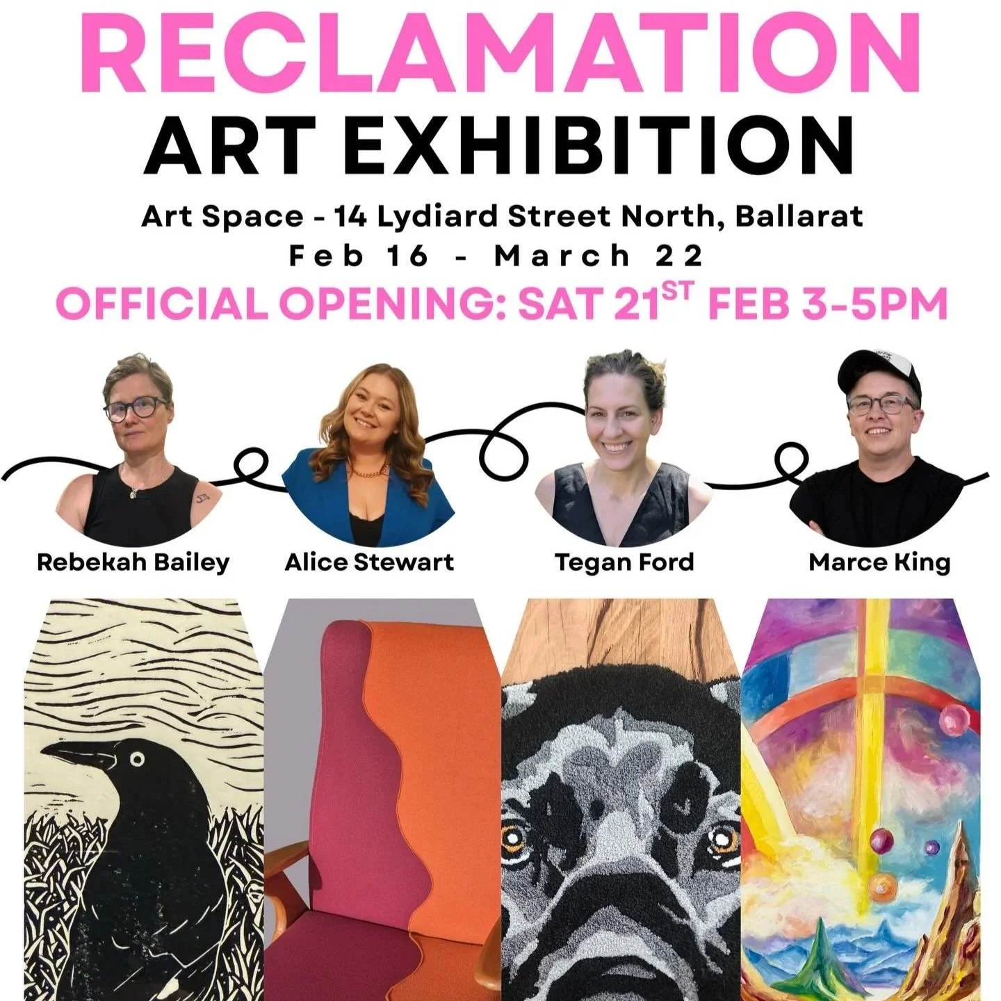 This exhibition showcases an exciting mix of artistic practices that bridge the gap between fine art and craft, offering viewers a unique experience of multidisciplinary creativity. Artists included in Reclamation are Alice Stewart, Tegan Ford, Rebekah Bailey, and Marce King.
